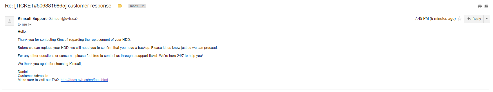 最后更新: 从第一个Ticket到最后一封邮件确认Resuce模式的邮件发来, 总耗时29分钟,。 硬盘换好