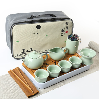 旅行便携包户外陶瓷功夫茶具套装汝窑青瓷企鹅壶办公日式干泡茶盘【包邮】