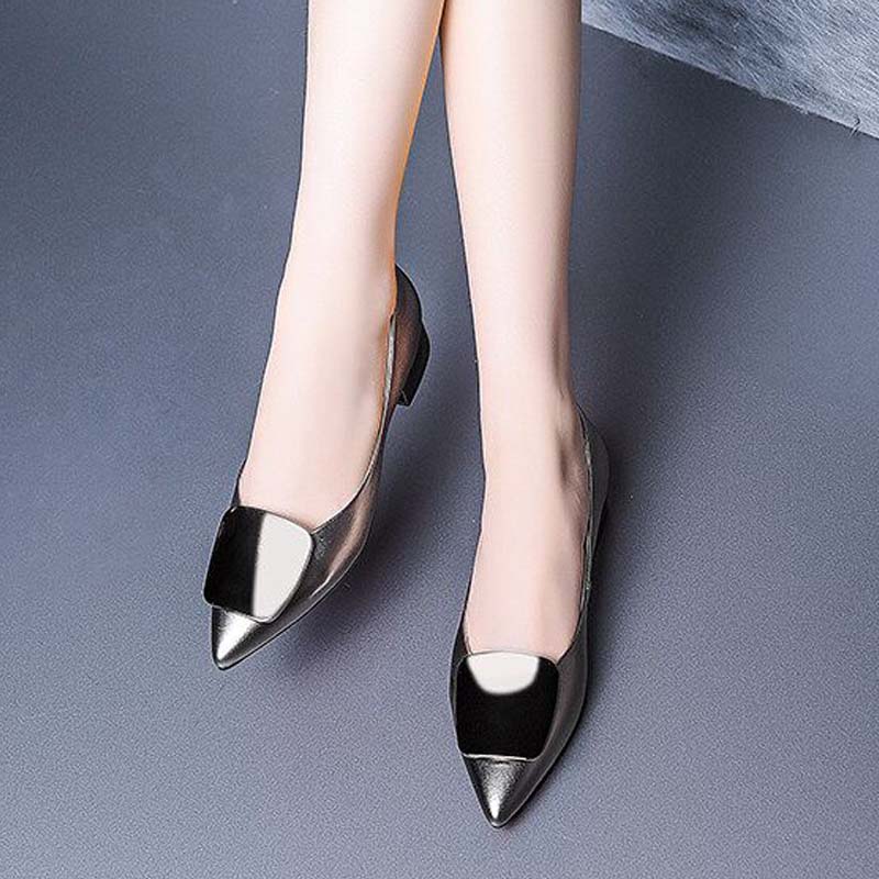 【商品名称】:粗跟单鞋女2019春季新款真皮中跟低跟浅口尖头四季黑色工作鞋瓢鞋
