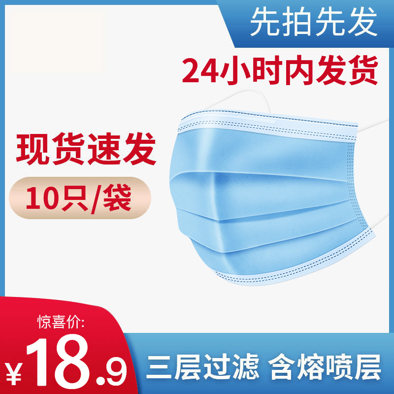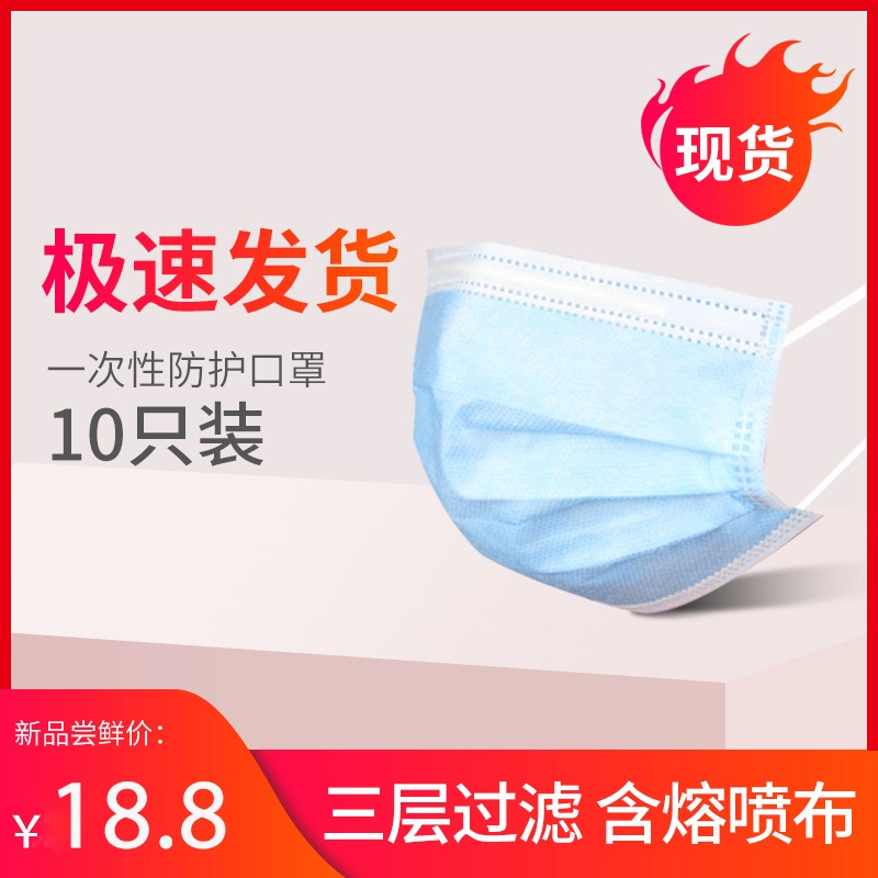 【商品名称】:现货一次性三层防护口罩面罩含熔喷层防尘透气口鼻罩防雾霾50只装